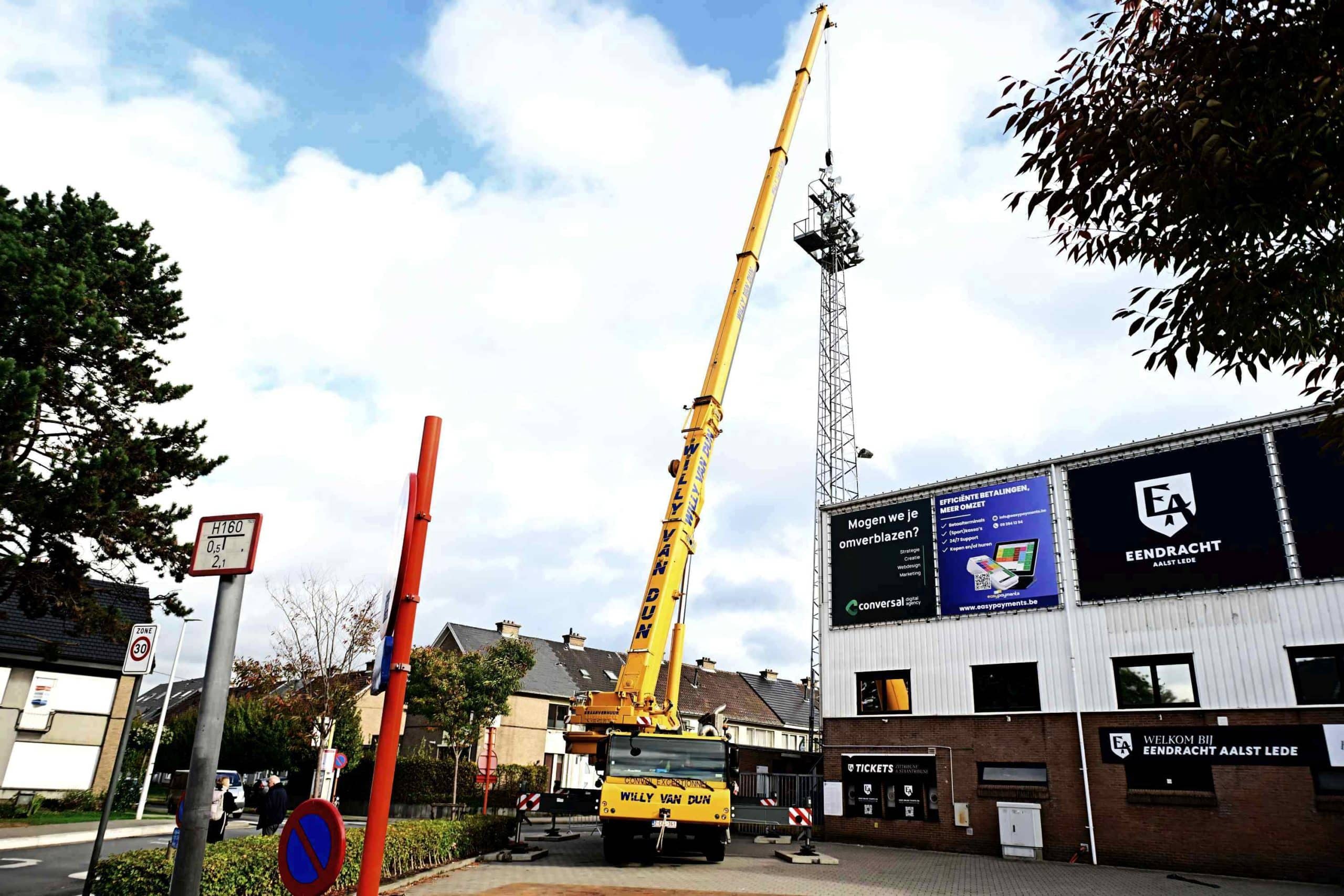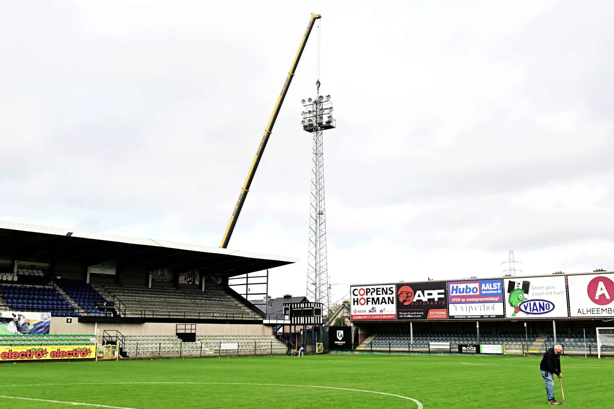 Nieuws — 21 oktober 2025 Afbraak lichtmasten gestart Home – Nieuws – Afbraak lichtmasten gestart Getuigen van een rijk verleden 21 oktober 2025 Na de wedstrijd tegen Berlare zijn de werken gestart om de lichtmasten te verwijderen. De afbraak was noodzakelijk door corrosie aan de basis van de masten. In november 1960, na de promotie naar Eerste Klasse, kreeg het Pierre Cornelisstadion ‘s lands beste lichtinstallatie. Ze werd ingehuldigd met een wedstrijd tegen Real Mallorca. In de jaren zeventig werden de pilonen verlaagd naar hun laatste vorm. Gerelateerd nieuws Nieuws — 25 november 2025 Welkom Dave De Herdt! Nieuwe HOOFDcoach Eendracht Aalst Lede heeft een overeenkomst bereikt met Dave De Herdt (45) als nieuwe coach en opvolger van Sandy Casieris. Van leerling tot…Lees meer Nieuws — 20 november 2025 100% Iendracht, 100% Oilsjters DNA Twee supporters door de woestijn Mogelijk is er jou de voorbije weken een gevelreclame opgevallen tussen de Heilig Hartkerk en het Pierre Cornelisstadion. Een foto…Lees meer Nieuws — 17 november 2025 Afscheid van Sandy Casieris Tommy De Kegel neemt voorlopig over Het clubbestuur heeft een einde gemaakt aan de samenwerking met coach Sandy Casieris. We houden eraan Sandy te bedanken…Lees meer
