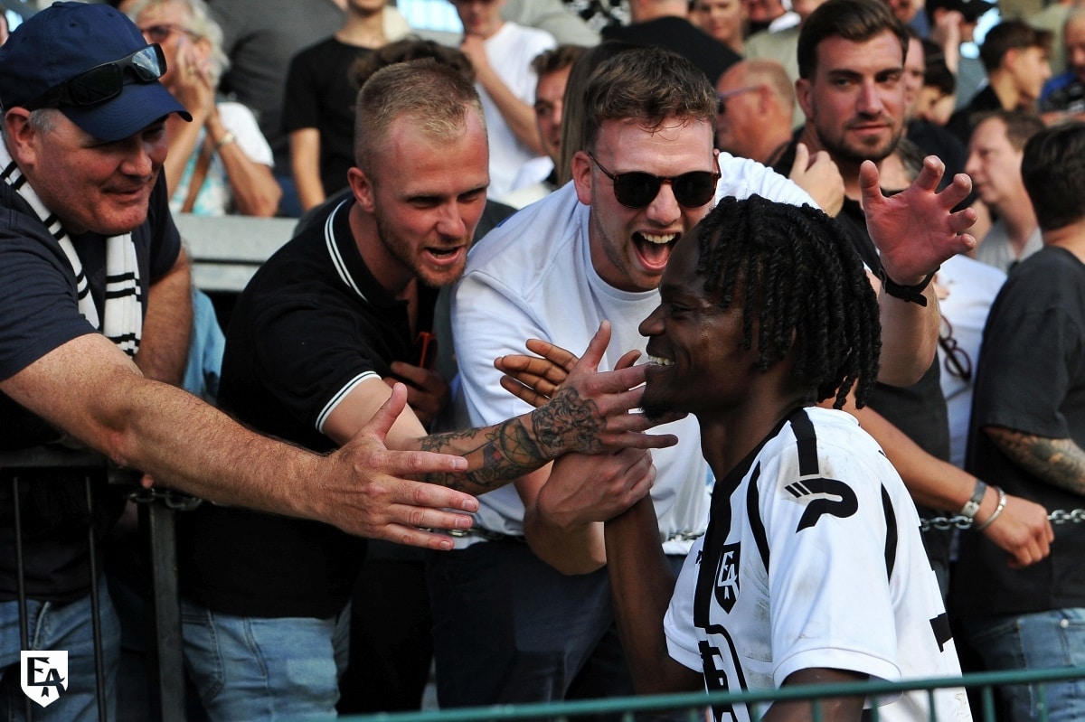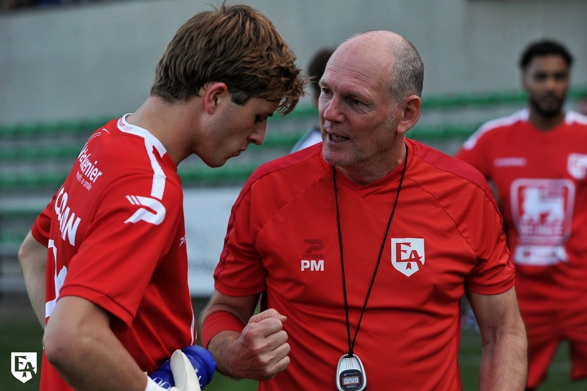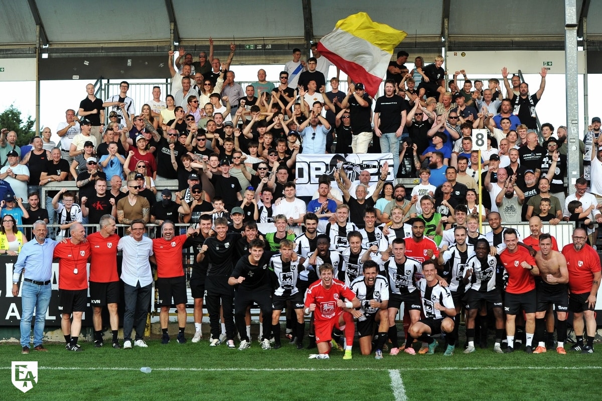 Eendracht VS Eendracht Termien Zondag 7 september, 16u00 Pierre Cornelisstadion Croky Cup Home - Wedstrijden - Eendracht Aalst Lede – Eendracht Termien Wedstrijdfases Verslag Video Foto Livestream 120' Het schot van Van Den Eeckhout is te centraal om de doelman te bedreigen. 120' Strafschoppen zullen beslissen wie zich mag opmaken voor een duel tegen een eersteklasser in de volgende ronde. 118' Gele kaart voor Wantens. 115' Een reflex van Cooman voorkomt een tegentreffer. 110' Zowel Geenens als Janssen blijven liggen na een kopduel. Allebei spelen ze verder met een verband aan het hoofd. 106' We beginnen aan de tweede verlenging. Van Den Eeckhout speelt deze in de plaats van Lanckman. 105' De brilscore staat nog steeds overeind. Nog een kwartier om strafschoppen te vermijden. 104' Ndefe mikt met links te hoog. 103' Janssen knikt de vrije trap van Davies naast doel. 101' De trap van Cuypers gaat via het lichaam van Dekuyper over. De hoekschop levert niets op. 99' Cooman staat op de goede plaats bij het schot van El Gardoui. 97' Straetman wordt vervangen door Hornick. 94' De ingevallen Mpeti Mambo schiet van ver naast. 92' Ndefe knalt hard naast. 91' De eerste verlenging is van start gegaan. 90' Geen doelpunten en dus ook geen winnaar na negentig minuten. We krijgen verlengingen. 85' De poging van Triest wijkt af en belandt bij de doelman. 77' Valkeners plukt de voorzet van Straetman uit de lucht. 74' Na een ingestudeerde hoekschop raakt de trap van Straetman niet door het bos van verdedigers. 72' Cooman bokst de indraaiende vrije trap van Davies weg. 70' Triest knalt de beste kans van de match over na een lage voorzet van Remacle. 65' Het kopballetje van Favoreel wordt makkelijk gepakt door Valkeners. 63' Driedubbele wissel. Rosschaert, Van Peteghem en Kofi Nyarko gaan naar de kant voor Odjidja, Remacle en Triest. 58' Cooman gaat goed plat op het schot van Cuypers. 57' De gekwetste Stefani wordt vervangen door Ovnicek. 50' Van Peteghem krijgt een lichte duw in het strafschopgebied. De scheidsrechter laat verder spelen. 46' De tweede helft is begonnen. Er zijn geen vervangingen. 45' Beide trainers krijgen een gele kaart onder de neus geduwd. 41' Straetman neemt een voorzet ineens op de slof. De bal gaat over. 35' Tot een doelrijpe kans komen, is iets waar de twee ploegen nog niet in geslaagd zijn tot nu toe. 28' Ndefe krijgt geel voor een schwalbe. Dit lijkt ons toch een verkeerde inschatting van de scheidsrechter. 26' Cooman is attent en grijpt de bal vast voor de neus van Dauwe. 21' De scherpe voorzet van Wantens kan door niemand worden overgenomen. 17' Cuypers kan uithalen na een hoekschop. De poging wordt afgeblokt. 8' De bal wordt op de helft van de tegenstander gerecupereerd. Nadien belandt de voorzet van Ndefe in het zijnet. 4' Scheidsrechter Claes moet al snel een eerste brandje blussen. 1' De partij is op gang getrapt. VOORAF' Volg deze namiddag hier LIVE de wedstrijd tussen Eendracht Aalst Lede en Eendracht Termien. Een echte cupmatch waar er veel op het spel staat: de winnaar zal immers uitkomen tegen een eersteklasser! RUST' Beide ploegen gaven elkaar geen duimbreed toe in de eerste helft. Het verschil zal na de rust moeten gemaakt worden. STRAFSCHOPPEN' Cuypers scoort (0-1) STRAFSCHOPPEN' Dekuyper scoort (1-1) STRAFSCHOPPEN' El Gardoui trapt, Cooman redt (1-1) STRAFSCHOPPEN' Geenens trapt, Valkeners redt (1-1) STRAFSCHOPPEN' Ovnicek scoort (1-2) STRAFSCHOPPEN' Van Den Eeckhout trapt, Valkeners redt (1-2) STRAFSCHOPPEN' Davies trapt, Cooman redt (1-2) STRAFSCHOPPEN' Odjidja scoort (2-2) STRAFSCHOPPEN' Piras scoort (2-3) STRAFSCHOPPEN' Wantens scoort (3-3) STRAFSCHOPPEN' Neven scoort (3-4) STRAFSCHOPPEN' Hornick scoort (4-4) STRAFSCHOPPEN' Alkan scoort (4-5) STRAFSCHOPPEN' Favoreel scoort (5-5) STRAFSCHOPPEN' Mpeti Mambo trapt, Cooman redt (5-5) STRAFSCHOPPEN' Ndefe scoort!!! Eendracht wint na een bloedstollende strafschoppenreeks met 6-5 en mag reikhalzend uitkijken welke eersteklasser uit de trommel komt! Sensatie in het Pierre Cornelisstadion want Den Iendracht heeft alweer een bekerstunt te pakken. Het versloeg met Eendracht Termien een topper uit tweede nationale maar diende daarvoor wel verlengingen en strafschoppen te doorstaan. Veel strijd, weinig kansen Na de winst van vorige week in Erpe-Mere zagen we dezelfde elf aan de aftrap verschijnen. Bryan Londot en Joran Triest waren terug fit en namen plaats op de bank. De eerste helft was aangenaam om volgen maar vooral omwille van de intensiteit en het hoge tempo. Kansen waren echter schaars. Opvallend daarentegen was dat vooral Robby Ndefe geviseerd werd en meer dan eens foutief onderuit werd gehaald. Opmerkelijk was dat de scheidsrechter daar geen graten in zag. Meer zelfs, Ndefe kreeg zelf een geel karton onder de neus geduwd. Als we dan toch een paar gevaarlijke fases dienen te vermelden, is het de voorzet van Lars Wantens waar niemand de voet kon tegen zetten (21’) en het vluchtschot van Bob Straetman, dat over ging (41’). Ook in de tweede helft leek Termien zich aan te passen. Het veinsde blessures om tot drankpauzes te komen en het tempo te breken. Doelman Ebbe Cooman moest een eerste keer plat bij een afstandsschot van Cuypers (58’). Op het uur kwam er een driedubbele wissel. Joran Triest, Mathis Remacle en Vadis Odjidja losten Kofi Nyarko, Nicolas Van Peteghem en Jarne Rosschaert af. De frisse krachten zorgden snel voor meer lokale druk. Een lage voorzet van Remacle werd door Triest over gemikt (70’). Halve kansen langs beide kanten volgden, maar zonder succes. De Limburgers kwamen er niet meer uit maar haalden moeiteloos de verlengingen. Geen winnaar na 120 minuten In de eerste vijftien minuten besloot Robby Ndefe twee keer over doel en kopte een alleenstaande Janssen naast. Ook een scrimmage in het bezoekend doelgebied leverde geen treffer op (105’). De tweede verlenging was er dan toch wat meer overwicht van Termien. Ebbe Cooman hield met een knappe reflex de nul (115’). Het laatste gevaar kwam van 