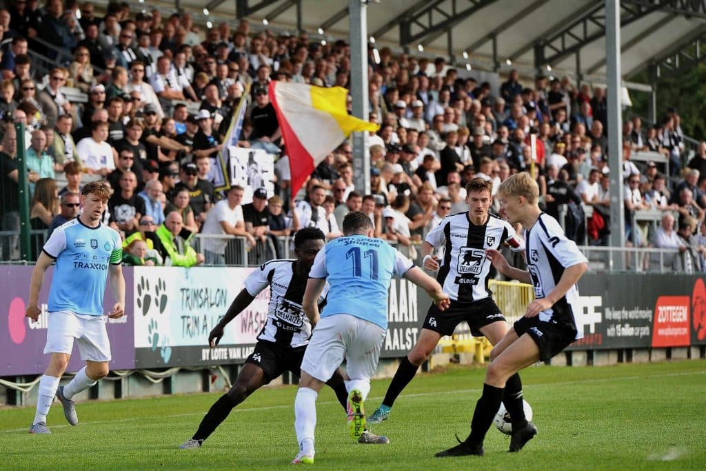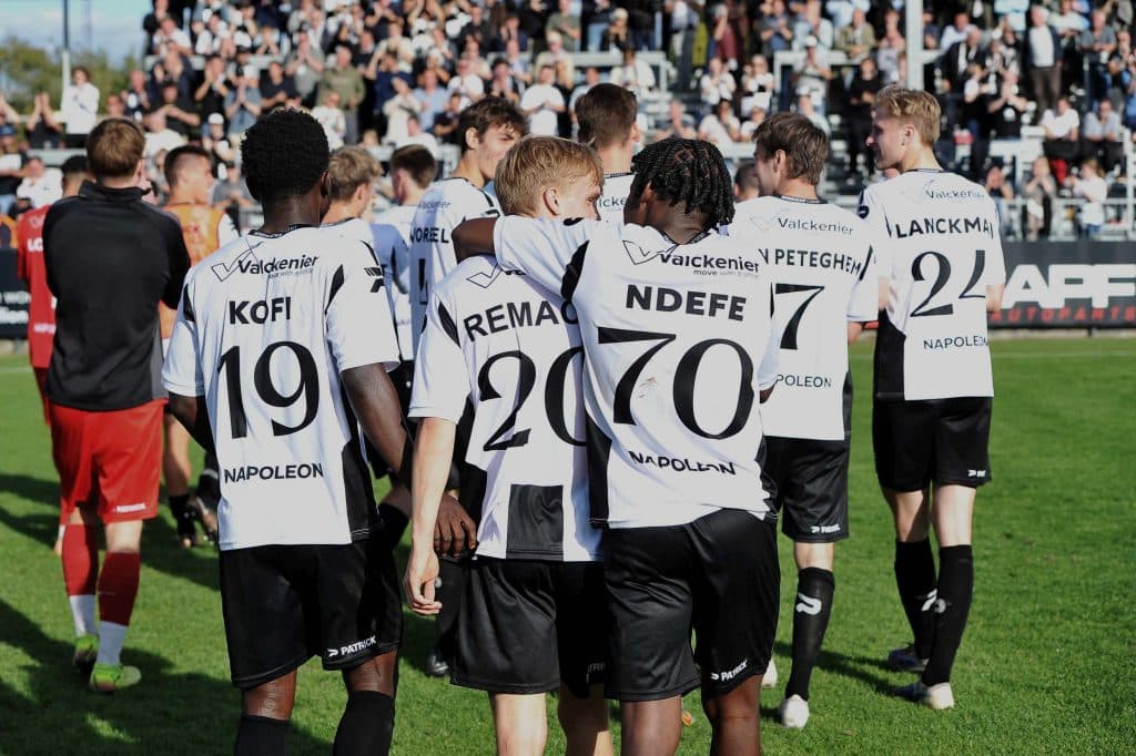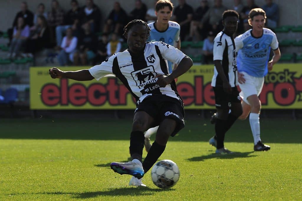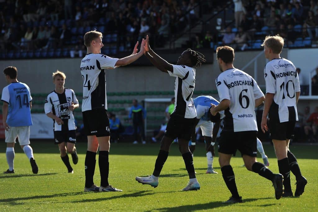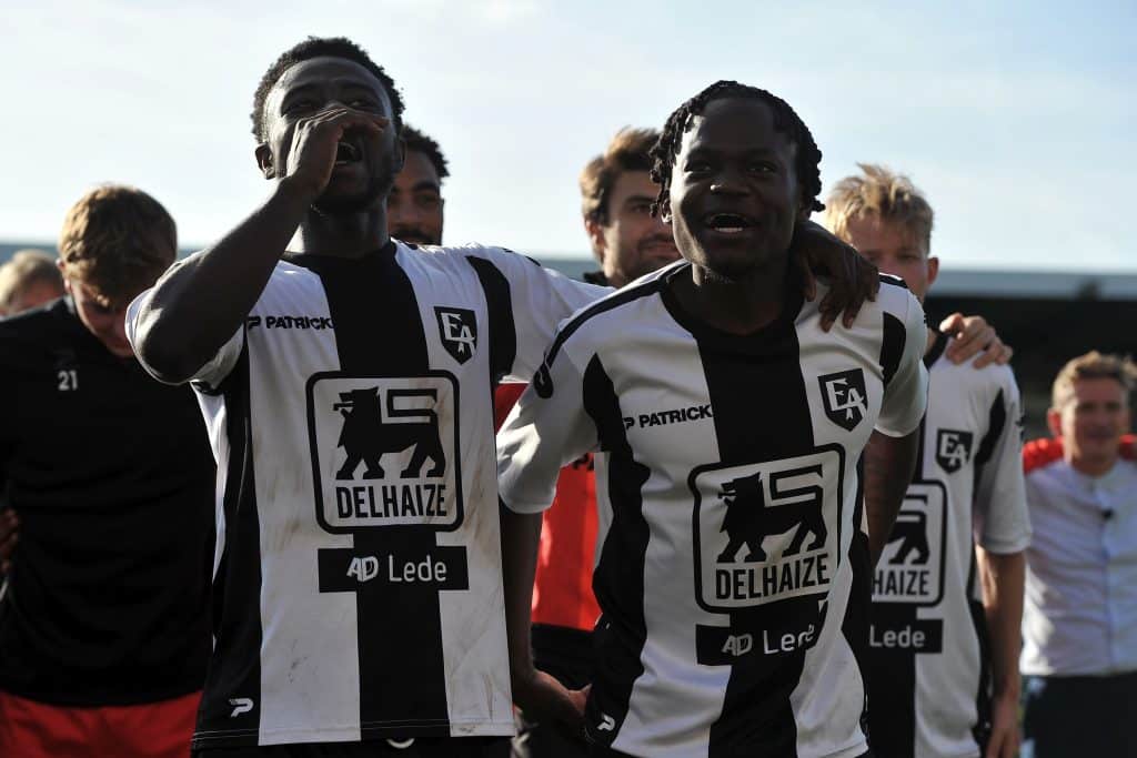 Eendracht VS KVE Drongen Zondag 28 september, 15u00 Pierre Cornelisstadion Derde nationale 2-1 Home - Wedstrijden - Eendracht Aalst Lede – KVE Drongen Wedstrijdfases Verslag Video Foto Livestream 92' Het schot van Hornick gaat centimeters naast. De scheids fluit af. Eendracht wint met 2-1 90' We gaan de extra tijd in. 88' Wantens krijgt geel voor protest. 86' De Bruyne krijgt geel. 84' De Rock zet de strafschop om. Het wordt 2-1. 83' Penalty voor Drongen. 80' GOAL!!!! Ndefe zet de strafschop om. 79' Penalty voor Eendracht na een fout in de zestien op Hornick. 74' Dubbele wissel bij Eendracht: Van Peteghem en Straetman gaan eruit. In hun plaats komen Rosschaert en Rasschaert. 73' Vervanging bij Drongen: Wymeels komt voor de geel geboekte Hilal Amine 69' Op een voorzet van Wantens schiet Van Peteghem net naast. 66' De vrije trap van Straetman vindt de vuisten van Frans. 65' Een tweede gele kaart voor Drongen. Hilal Tashine-Amine gaat in het boekje. 63' Vandevyvere kopt een voorzet over. 60' Geenens wordt geblesseerd vervangen voor Hornick. 59' Dubbele vervanging bij Drongen: Criel en Van Belle worden vervangen door De Bruyne en Van Loocke. 58' Van Peteghem speelt de vrijstaande Kofi aan maar hij besluit over en naast. 52' Sy krijgt de eerste gele kaart onder de neus nadat hij Kofi foutief afstopt. 50' Ndefe wordt op rechts aangespeeld door Straetman, maar zijn schot gaat naast. 46' De tweede helft is gestart. 45' De scheidsrechter beëindigt de eerste helft. We gaan rusten met een 1-0 voorsprong. 34' Geenens staat geblesseerd langs de kant. Maar hij kan de wedstrijd hervatten. 33' Een voorzetschot van Van Peteghem gaat voorlangs. Eendracht controleert de wedstrijd en toont drang naar voor. 21' Ndefe zet voor, Straetman kan er zijn hoofd tegen zetten maar Frans klemt de bal. 14' GOAL!!!! Op voorzet van Straetman kopt Kofi de 1-0 tegen de touwen. 11' Wantens schiet voorlangs na een mooie actie van Remacle. 7' Mooie voorzet van Wantens, Ndefe kan er net niet bij. 4' De eerste kans is voor de bezoekers. Een hoekschop wordt niet ver naast gekopt door Tashine-Edine. 2' Vrije trap op een gevaarlijke plek. Maar Cnockaert schiet ver naast. 1' De wedstrijd start met 1 minuut stilte voor de overleden grootvader van Jari Bauwens. We zijn eraan begonnen: De Rock trapt de wedstrijd op gang. VOORAF' Ndefe, Wantens en Van Peteghem zijn opnieuw van de partij. Odjidja, Van Leuven en Triest zijn nog niet inzetbaar. We hopen op een driepunter na de 5 op 12. Iendracht Veroit! VOORAF' Terug naar 1995...30 jaar geleden speelde Eendracht Aalst europees! De spelers worden vandaag nog eens gehuldigd: we herkennen o.a. Kanu, Smets, Mannaert, De Meyst, Benali, Van Riel, Van Wambeke, Vanderhaege, Paas, Lamberg, Van Ankeren, De Bilde en trainer Jan Ceulemans. Hoewel deze wedstrijd zeker niet van een oogstrelend niveau was, behaalde Eendracht wel verdiend de nodige overwinning. Lars Wantens, Nicolas Van Peteghem en Robby Ndefe waren opnieuw van de partij in de basiself. Voor Joran Triest en Vadis Odjidja bleek het wederoptreden nog te vroeg te komen. Overwicht beloond De eerste mogelijkheid was voor Drongen. De lange Van Handenhove kopte op hoekschop nipt naast (3’). Achteraf bleek dat dit vrijwel hun enige te vermelden wapenfeit was. Gesteund door een geweldig publiek, dat werd opgewarmd door de helden van 1995, nam de thuisploeg volop het initiatief. Na een knappe combinatie mikte Lars Wantens nipt naast de verste paal (10’). Amper later volgde het openingsdoelpunt. Via Bob Straetman kwam de voorzet tot bij Kofi Nyarko die raak kopte: 1-0 (13’). Bob Straetman probeerde zelf de score te verdubbelen maar zijn kopbal plofte in de handen van doelman Frans (20’). Het lokale overwicht bleef van kracht. Kansen creëren lukte echter niet meer en vrij emotieloos werd de rust bereikt met de kleinste voorsprong. Strafschoppen leggen eindcijfers vast Meteen na de pauze besloot Robby Ndefe eerst net naast (49’) en later over het doel na een mooie aanval (57’). Ook nu bleef Eendracht vrij makkelijk het overwicht behouden maar doelrijpe kansen vielen er niet te noteren. Bob Straetman plantte een vrije trap op de vuisten van Frans (64’). Het einde was al in zicht wanneer de ingevallen Jelle Hornick onderuit werd gehaald in de strafschopzone. Robby Ndefe klaarde makkelijk de klus en verdubbelde de bonus (79’). De buit leek binnen maar de spanning keerde snel terug. Ook de bezoekers mochten een strafschop nemen en Thijs De Rock milderde (83’). De Gentenaars probeerden het nu met het droppen van de lange bal in de box. Doelman Bryan Londot heerste echter in de lucht en plukte er alles perfect uit weg. In blessuretijd plaatste Jelle Hornick nog eens voorlangs (91’). De amper 20-jarige scheidsrechter floot even later de vrij kansarme wedstrijd af. Het belangrijkste doel, de 3 punten pakken, werd bereikt waardoor Eendracht behoorlijk opschuift in het klassement. Volgende week is er de verplaatsing naar Eendracht Elene-Grotenberge. Verslag: Roland Creutz Redactie: webteam Match info Eendracht Aalst Lede 2 KVE Drongen 1 Zondag 28 september, 15u00 Pierre Cornelisstadion Bredestraat z/n/ 9300 Aalst 14' Emmanuel Kofi Nyarko 1-0 (Assist: Straetman)80' Robby Ndefe 2-084' De Rock 2-1 52' Sy 85' De Bruyne 88' Lars Wantens Eendracht Aalst Lede 1 Bryan Londot 4 Ilian Favoreel 5 Lars Wantens 7 Nicolas Van Peteghem 11 Bob Straetman 18 Falko Geenens 19 Emmanuel Kofi Nyarko 20 Mathis Remacle 24 Simon Lanckman 26 Calvin Dekuyper 70 Robby Ndefe Wissels 60' Jelle Hornick 74' Jarne Rosschaert 74' Arthur Rasschaert 60' Falko Geenens 74' Nicolas Van Peteghem 74' Bob Straetman KVE Drongen 13 Kevin Frans 2 Ilias Van Belle 4 Kjell Vandevyvere 6 Biko Fordjour 8 Moulaye Sy 11 Cor-Pieter Pander 17 Arne Van Handenhove 19 Floris Criel 21 Tahsine-Edine Hilal Amine 23 Brecht Knockaert 99 Thijs De Rock Wissels 59' Van Loocke 59' De Bruyne 69' Wymeels 59' Criel 59' Van Belle 69' Hilal Amine